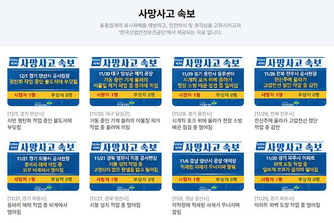 전국 건설 현장의 사망사고 소식을 실시간으로 제공합니다.