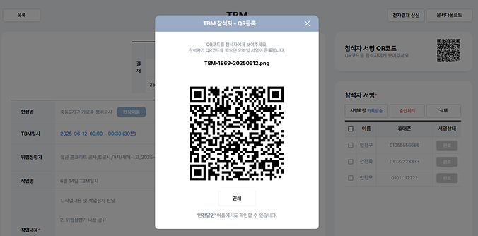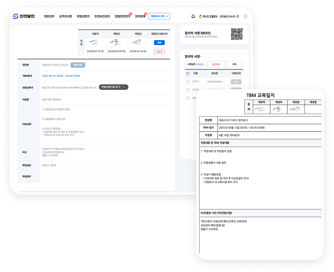 모든 TBM 점검 결과는 모바일 일지에 실시간 기록되며,