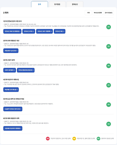 법령 기반 템플릿으로 제공하여 안전시스템을 구축하고 운영할 수 있습니다.