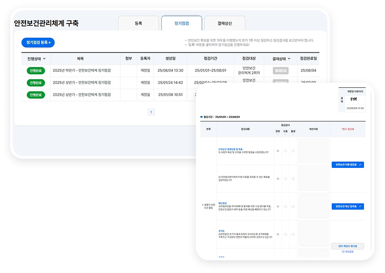 서식 템플릿 제공부터 점검일 스케줄링, 전자결재 연동까지 법적 의무 이행을 지원합니다.