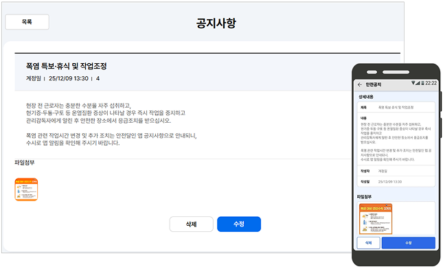태풍 특보나 긴급 작업 변경 등 중요한 공지 사항을