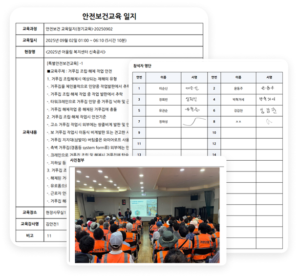 훈련 일시·장소·참석자 정보를 현장별로 기록해 공백 없는 관리가 실현됩니다.